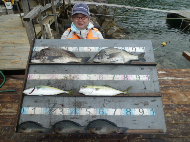 【曇り一時小雨、湾内波なし、ヘタが崎ウネリ有り】 一番船6:00 最終船17:00 高浜町のおかもとさんが排水口筏で チヌ 47〜52p 2匹、 ハマチ 42〜22p 2匹、 グレ 25〜30p 3匹