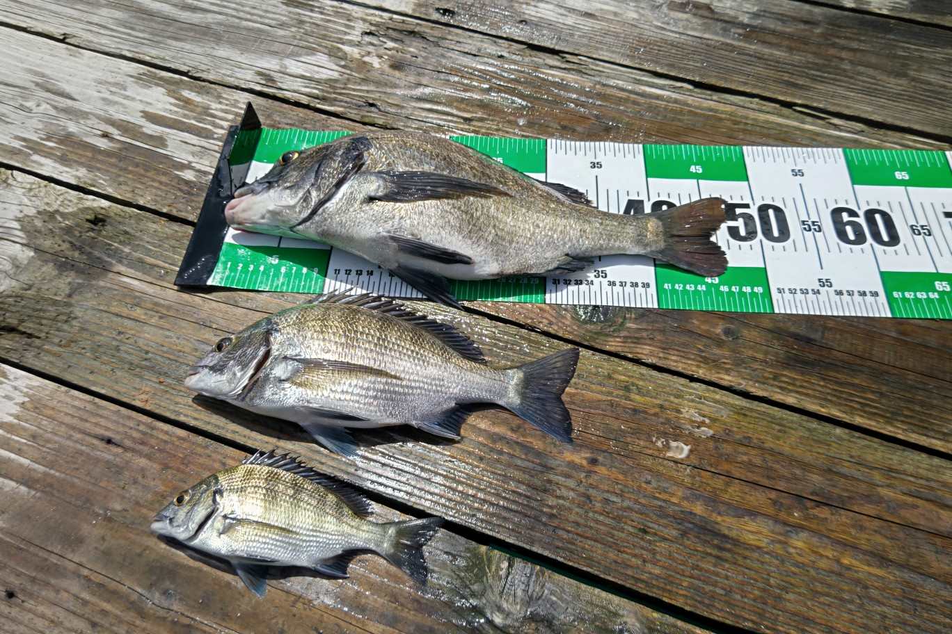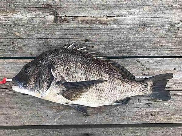 舞鶴市の高山氏が潜水艦筏で チヌ 30〜40p 3匹(サバ入れ食い全てリリース) 【磯竿 ハリス1.7号 オモリ1号 ウキ下6〜7ヒロ チヌ3号針 オキアミ】