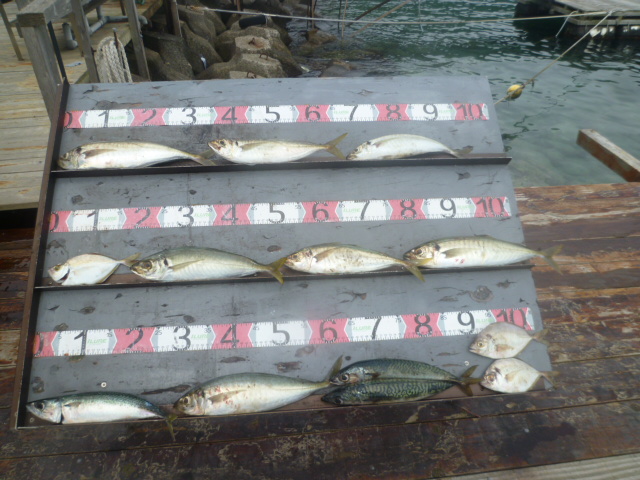 【曇り時々小雨、波なし】 一番船5:30 最終船ヘタが崎16:45 湾内17:00 京都市も福永氏が湾内筏で サバ 30〜35p 多数、 アジ 30〜35p 3匹、 サンバソウ 25p 1匹、 アコウ 15〜20p 3匹 草津市のポイキさんがヘタが崎沖筏で カイワリ 15〜20p 20匹、 アジ 32p 2匹 京都市の宮崎氏が湾内筏で アジ 30p 2匹、 サバ 30p 3匹、 サンバソウ 20p 1匹、 グレ 30p 1匹 京田辺市の宮本氏が潜水艦筏で サバ 30〜35p 2匹、 アオハタ 20〜25p 3匹 【ジグ】 岐阜市の太田氏3名様が潜水艦筏で アジ 30p 1匹、 サバ 30〜40p 多数(入れ食い)午後2時からの釣果 京田辺市の阿野氏2名様も潜水艦筏で サバ 30〜40p 70匹、 アジ 20〜30p 10匹、 アコウ 30p 1匹、 サンバソウ 25p 1匹、 グレ 25p 2匹 京都市の北村氏が潜水艦筏で アジ 35p迄 12匹