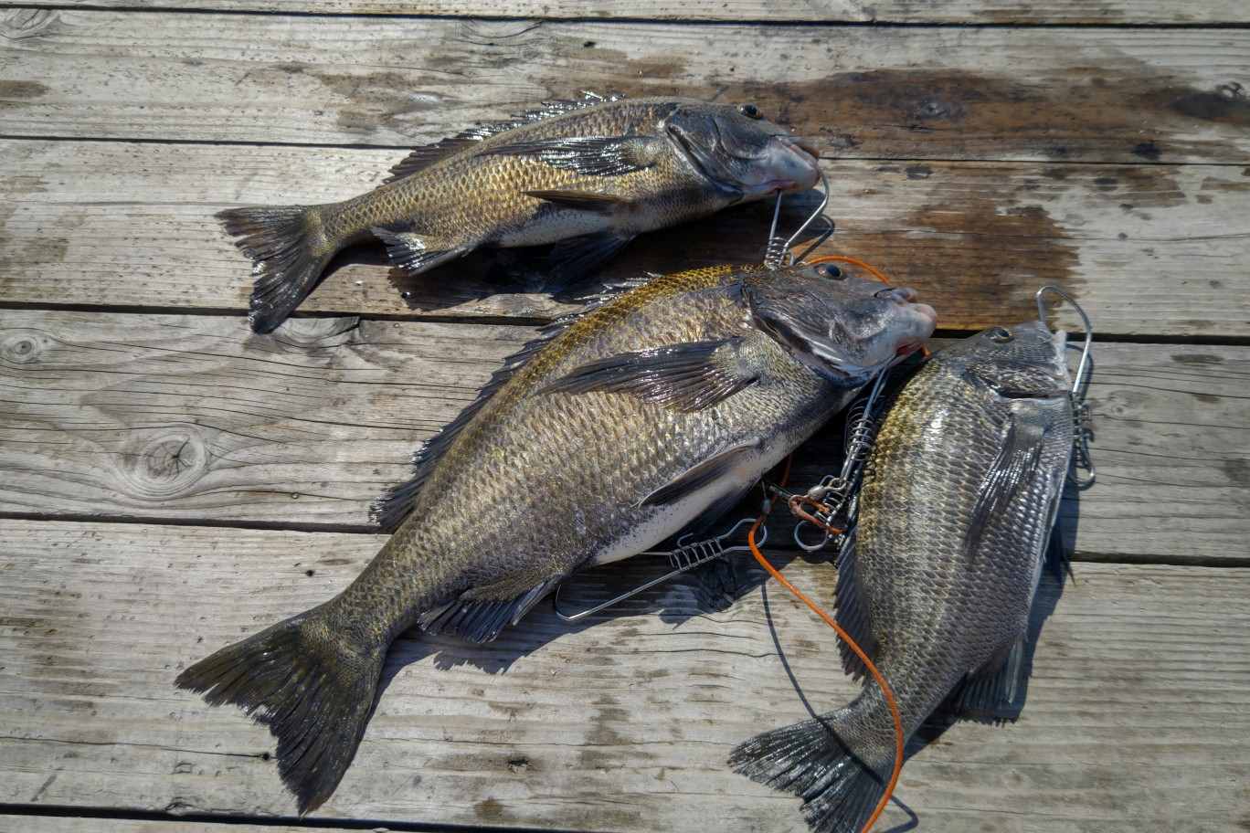 一ツ橋氏・永原氏も潜水艦筏で チヌ 30p・42p・44p 3匹、 サンバソウ 22〜23p 2匹、 カワハギ </font>25p 1匹 【短竿 ハリス1.75号 オモリなし チヌ3号針 サナギ】