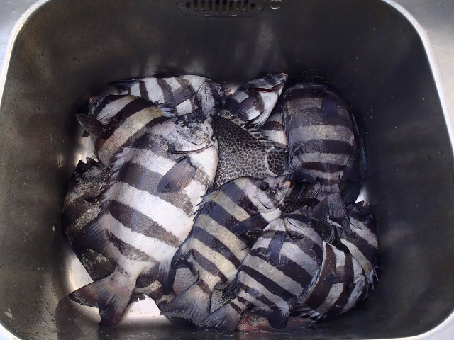 【曇り、波0.8m】一番船7:00 最終船15:30 亀井氏2名様が排水口筏で グレ 30〜37cm 15匹 (以下サイズリリース)、 イシダイ 30〜43cm 10匹、 イシガキダイ 38cm 1匹