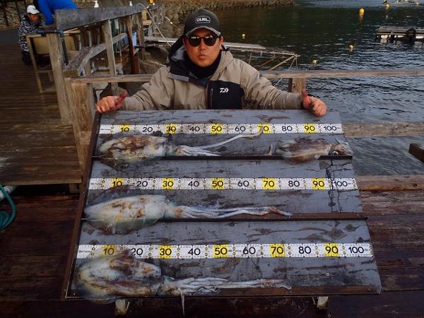 志水氏が潜水艦筏で グレ 36〜38cm 2匹、 チヌ 37cm 1匹、 サンバソウ 15〜18cm 10匹 京都市の利宗氏が潜水艦筏で アオリイカ 33cm(1600g)、32cm(1400g)、31cm(1350g)、25cm(700g) 【エギ3.5号】